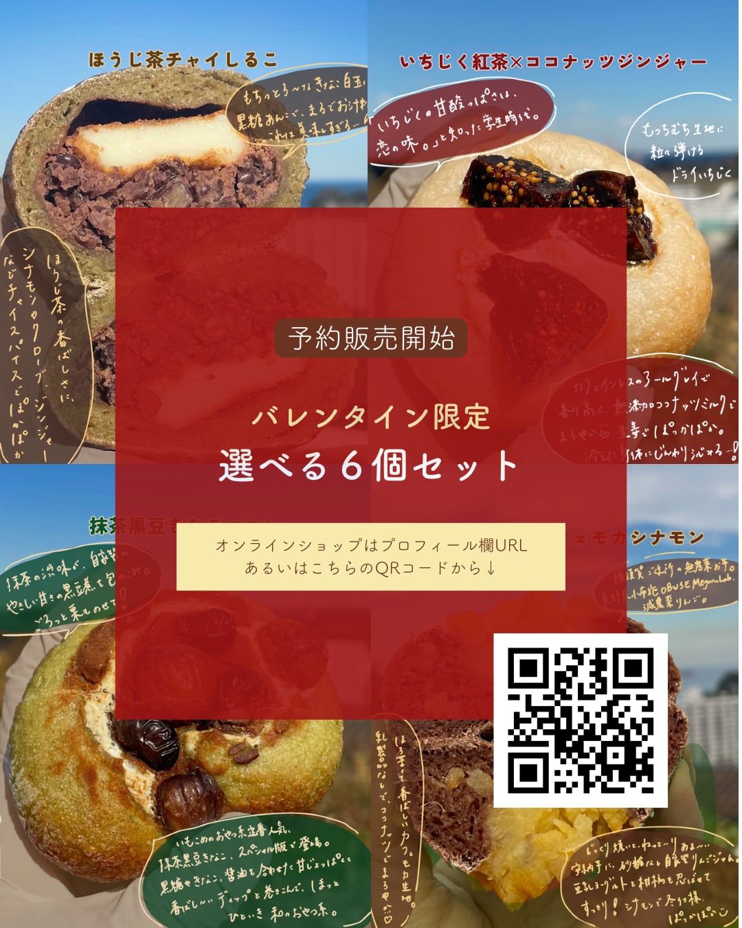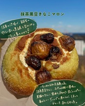・抹茶黒豆きなこマロンベーグル:いもこめの定番人気の抹茶黒豆きなこベーグルに、栗を合わせた、バレンタインスペシャル版登場。有機抹茶を使用したほろ苦い抹茶生地に、自家製の甘さ控えめ黒豆煮と、黒糖やきなこ、醤油で甘じょっぱい黒糖きなこディップ、ごろっと栗を合わせています。ほっとひとやすみしたいとき、気持ちをすぅっとほぐしてくれる和のおやつ系ベーグル。