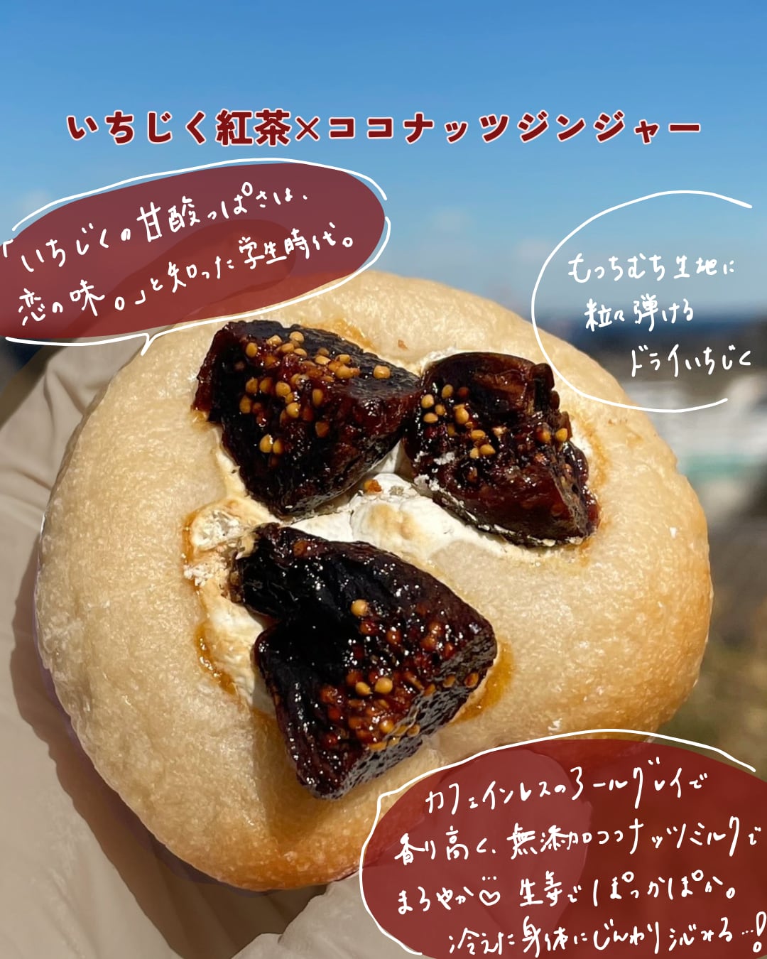・いちじく紅茶×ココナッツジンジャーベーグル:無花果の甘酸っぱさは、恋の味。と、学生時代に幾度も観た花より男子に教わりました。有機ドライいちじくをトップに、生地は紅茶(カフェインレスアールグレイを使用)と、無添加ココナッツミルクでやさしくまろやかな香り。ピリッと効かせた生姜がアクセントに。もっちむち生地に現れる、ドライいちじくの粒々食感。この食感にもやみつき!
