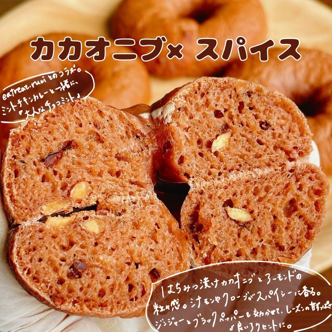 ・カカオニブスパイスベーグル:カカオのほろ苦さが、レーズンの甘酸っぱさとアーモンドの香ばしさを引き立てます。シナモンやクローブなどのスパイスの香りで奥行きのある味わいに。お食事系をイメージし、ブラックペッパーとジンジャーが後からピリッと効いてきます。ミネストローネやかぼちゃのポタージュ、人参ラぺなど、甘さのある洋風のデリやポタージュなどと特によく合います!もっちむちベーグルに映える、カカオニブやナッツの粒々食感、このコントラストにもハマります。