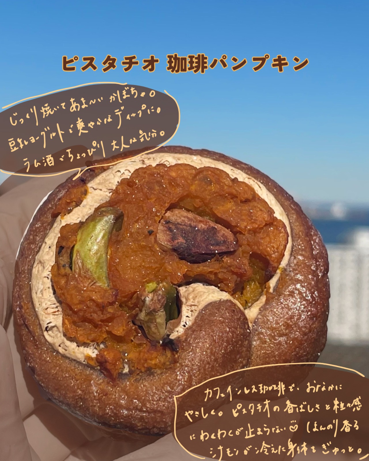 ・ピスタチオ珈琲パンプキンベーグル:じっくり焼いたかぼちゃに、豆乳ヨーグルトを合わせて爽やかなかぼちゃディップに。ラム酒を効かせてちょっぴり大人な仕上がり。珈琲生地(カフェインレス珈琲使用)のほろ苦さが、かぼちゃの甘さをぐっと引き立て、ピスタチオの香ばしさも相まって唯一無二のご褒美感。チョコをあげたい誰かを想い浮かべながら、まずは自分にご褒美を!